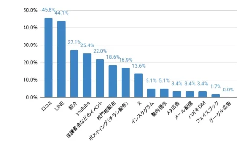 「今後取り組みたい施策」は、1位 口コミ(45.8%)、2位 LINE(44.1%)、3位 紹介(27.1%)という結果だが、「LINE」「YouTube」のほか、「X」「Instagram」も一部割合を占め、オンライン施策への興味も広がってきているという。