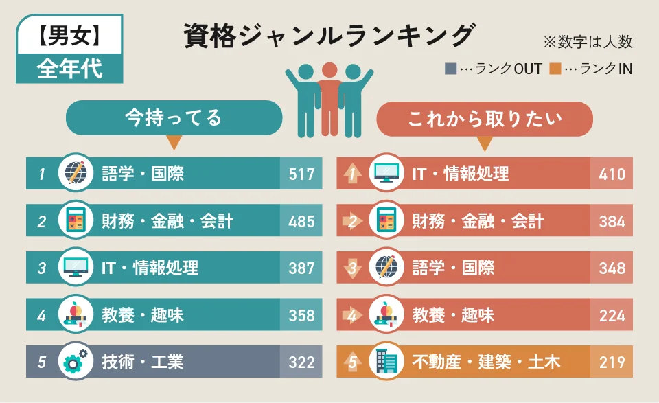 また、不動産・建築・土木系への関心が上昇。「今持っている資格」では9位だが、「これから取りたい資格」では5位に浮上。生活に密着したスキルとして、安定性への評価が高まっている傾向が明らかになった。