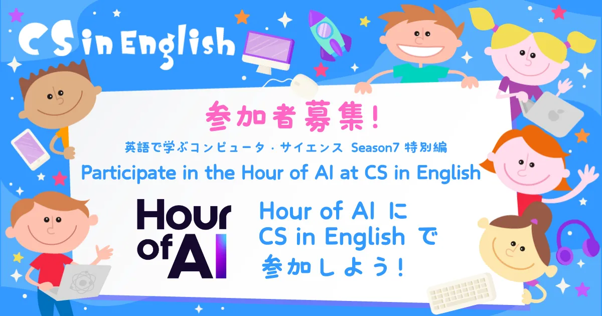 Kids Code Clubは、英語で学ぶコンピュータ・サイエンス(CS in English)Season 7 特別編「Participate in the Hour of AI at CS in English / Hour of AI に CS in English で参加しよう!」を12月7日にオンラインで開催する。