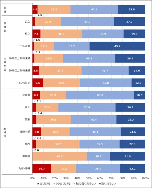 調査は9月26日~10月3日に行われ、公立私立の高校教員370名から回答を得た。それによると、66.2%が年内学力入試の拡大に否定的で、授業や学校行事への影響を懸念する声は75.7%に上った。
