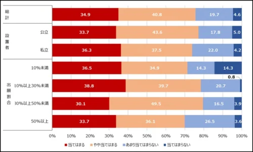 年内学力入試が拡大したとしても生徒の勉学にはつながらないと考えている人が75.2%に上った。年内学力試験における学力検査以外(面接・小論文など)の配点や評価ウエイトをもっと高くしたほうがよいかを訊ねたところ、否定的な回答が71.9%となった。