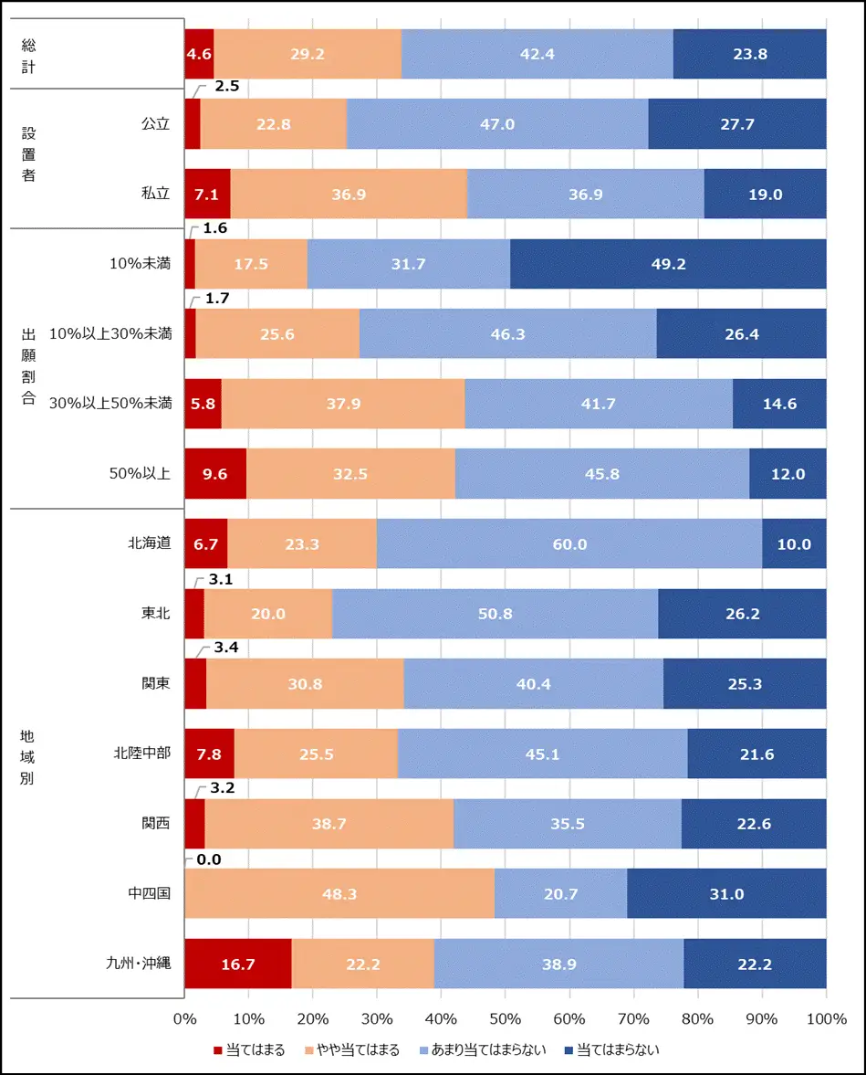調査は9月26日~10月3日に行われ、公立私立の高校教員370名から回答を得た。それによると、66.2%が年内学力入試の拡大に否定的で、授業や学校行事への影響を懸念する声は75.7%に上った。