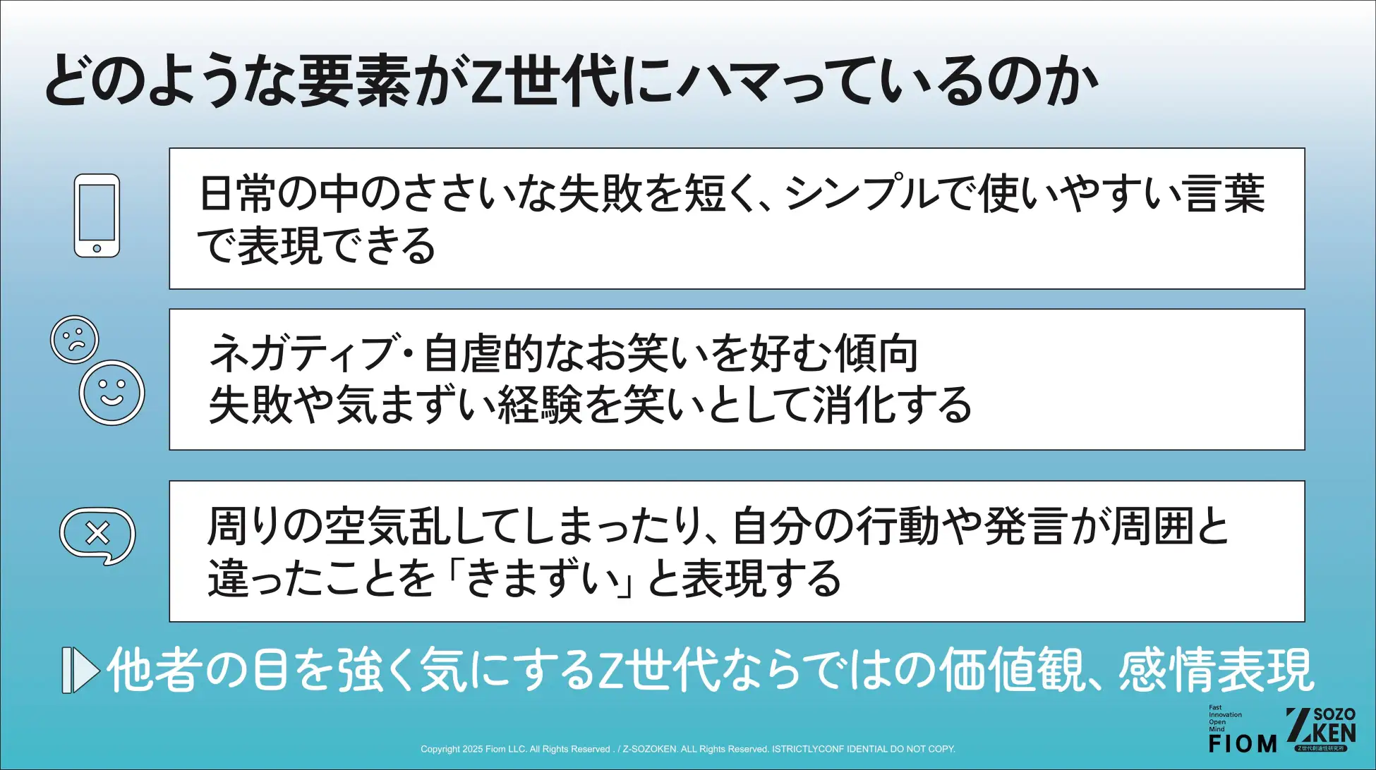 では、なぜ「気まずさ」がコンテンツとして流行するのかを分析したところ、その背景には、Z世代が「ネガティブ・自虐的なお笑いを好む傾向」、「失敗や気まずい経験を笑いとして消化する」文化があることが判明。一度の失敗が拡散されかねないSNS社会で、自らの失敗を「気まずい体験」としてネタにし、共感を得ることでダメージを軽減する、Z世代なりの生存戦略が見て取れる。