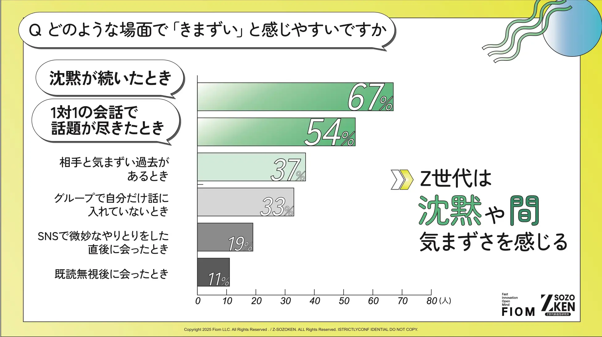 では、「どのような場面で気まずさを感じるか?」を聞いたところ、最も多かったのは「沈黙が続いたとき」67%で、次いで「1対1の会話で話題が尽きたとき」54%だった。Z世代は、会話の空白や間を「失敗」と捉え、強いストレスを感じる傾向にあるようだ。