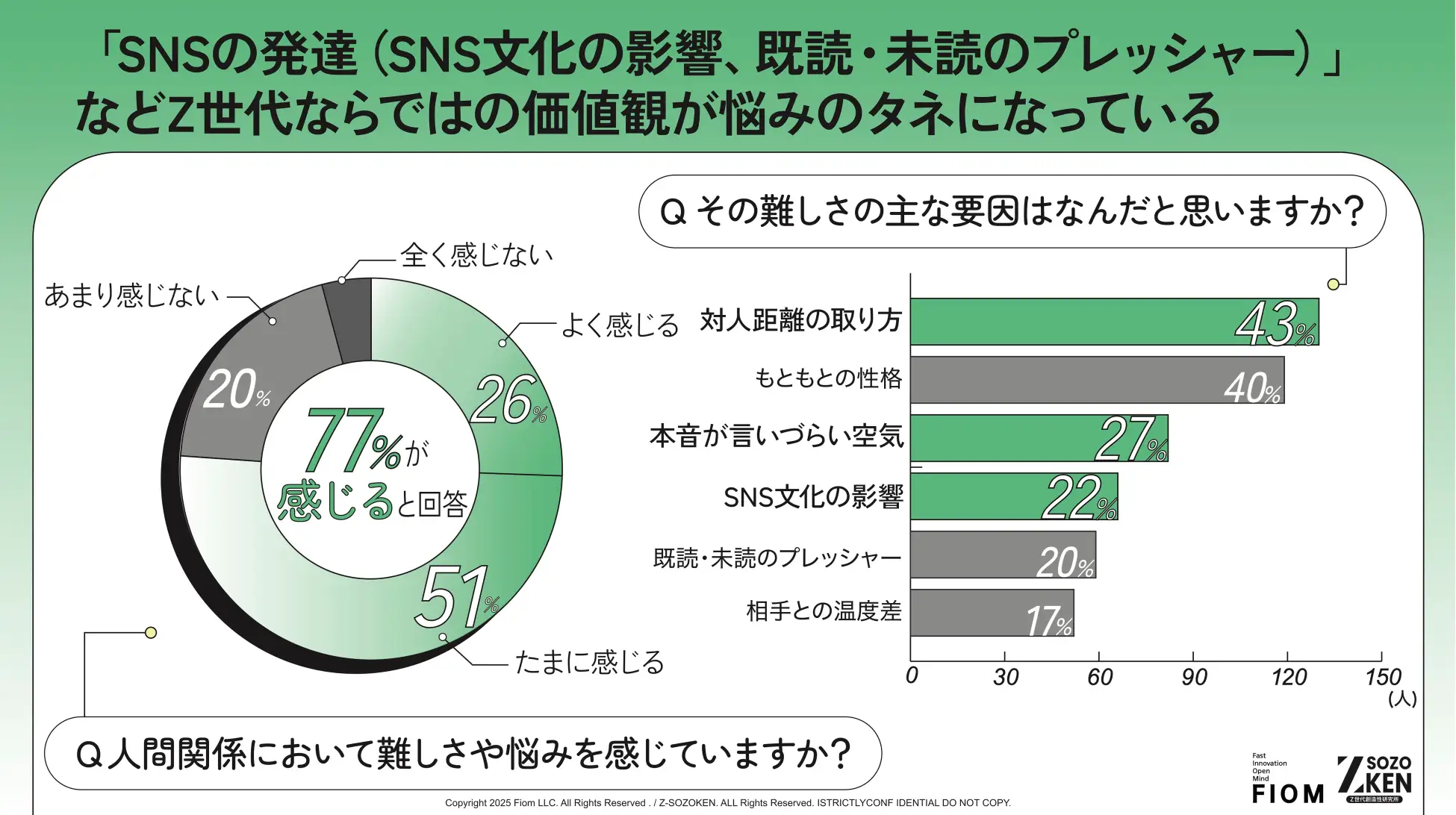 また、77%が「人間関係」に悩みを感じている中、その要因としては「SNS文化の影響」22%と、「既読・未読のプレッシャー」20%が多かった。「対人距離の取り方」43%という普遍的な悩みと並び、デジタルネイティブ特有の常時接続ストレスが人間関係を複雑にしているようだ。