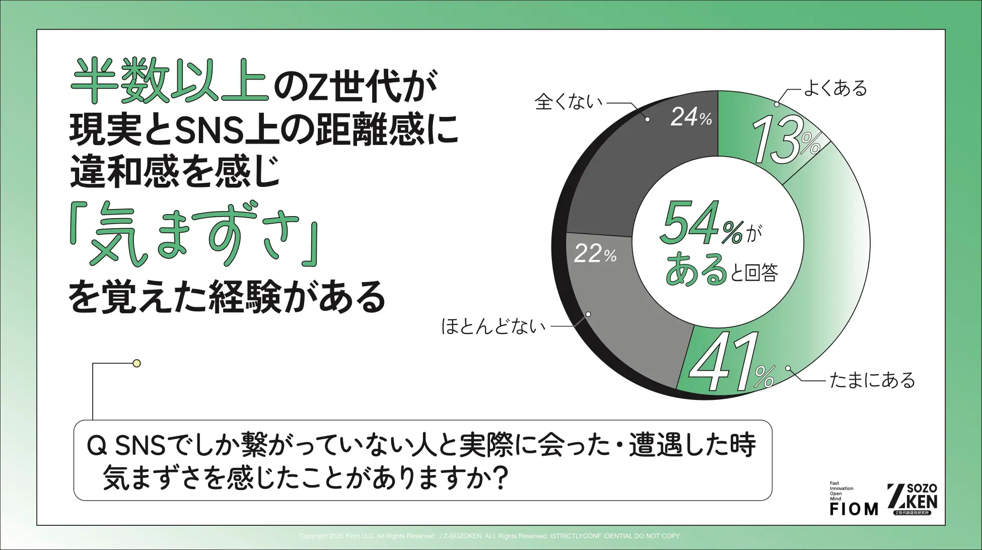 Fiomは19日、同社が運営するシンクタンク「Z-SOZOKEN」(Z世代創造性研究所)が、全国のZ世代(18~24歳)299人を対象に実施した、「Z世代の気まずい感覚についての意識調査」の結果をまとめ発表した。