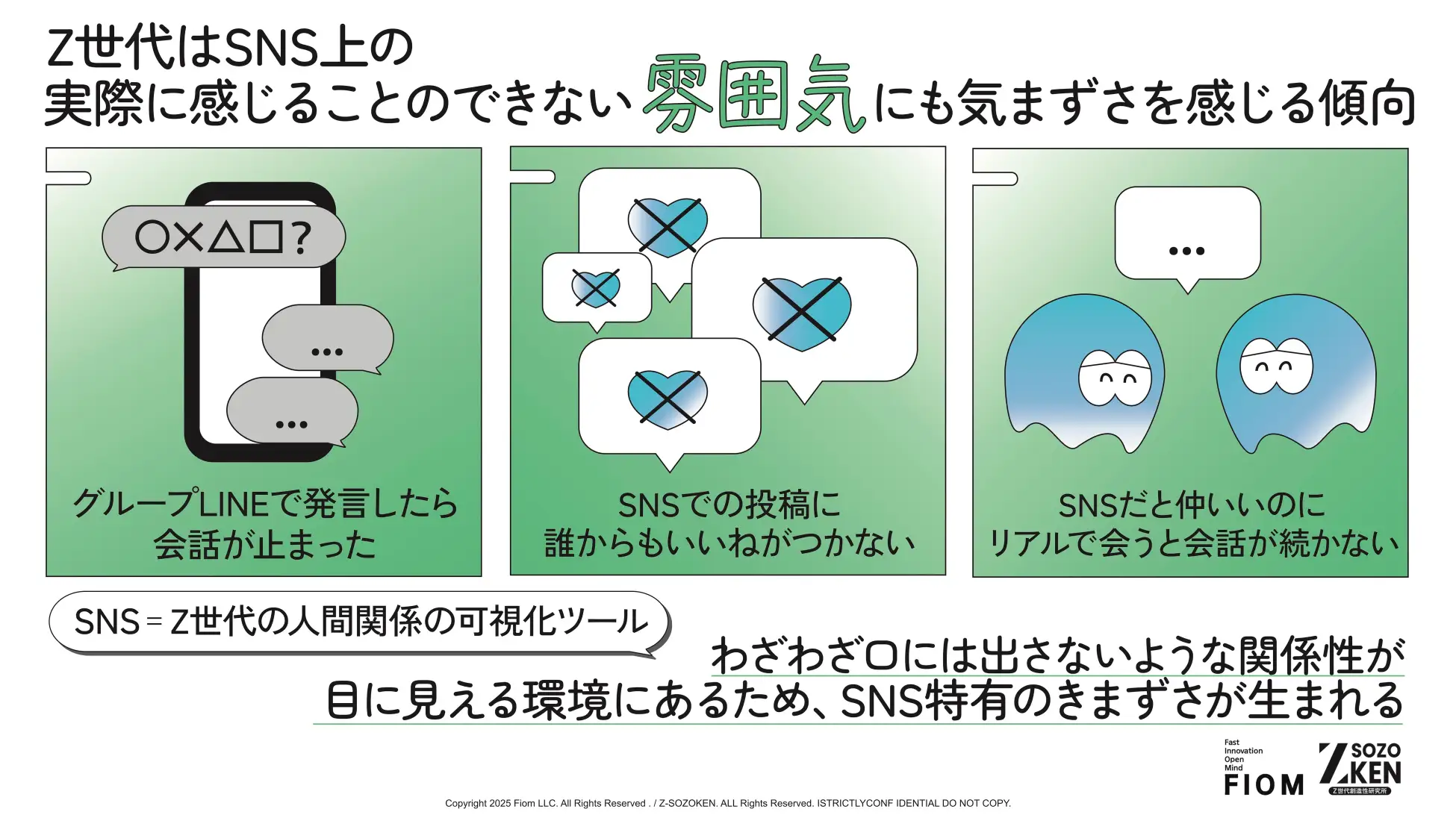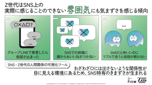 一方、Z世代はSNS上の目に見えない空気感に敏感で、「グループLINEで発言したら会話が止まった」、「SNSでの投稿に誰からも“いいね”が付かない」といった、関係性が数値やログで可視化されるSNS特有の現象に、「強い気まずさ」を感じていることが分かった。