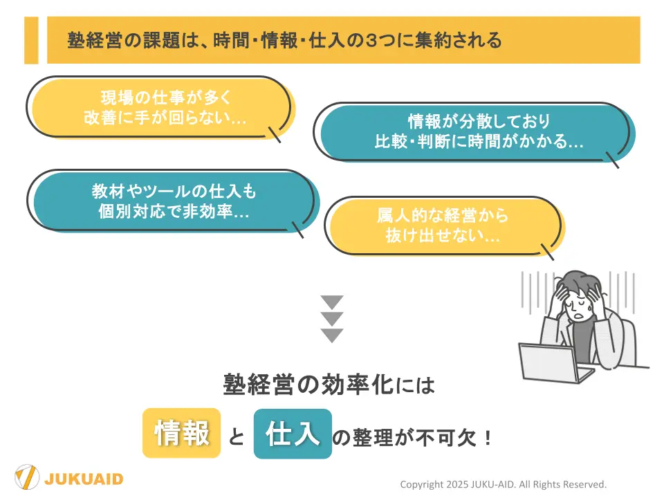 JUKU Plus!は、時間がない、情報がない、人がいないといった塾オーナーや教室長の課題を、塾エイドがボランタリーチェーンとして実現している「情報の集約」と「仕入の集約」によって解決するためのプラットフォーム。これまで試験的に運用を行ってきたが、今回正式にサービスをリリースした。