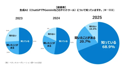 調査は、小学3年生~6年生とその保護者1032組を対象に11月5日・6日に行われた。それによると、生成AIの認知について、保護者は2023年の74.1%から2025年には89.6%、小学生は47.8%から74.7%へ。ほとんどの家庭が「生成AIという言葉は知っている」という状況になっている。