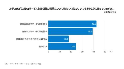 家庭における生成AIの利用環境を尋ねたところ、最も多いのは「保護者のスマホやPCなどのデバイスを使って子ども自身が使う」で、子どもが「自分のスマホ・PCなどのデバイスを使って自分で使う」が続き、「保護者が子どもの代わりに調べる」は2割弱にとどまった。家庭では「自分で使わせる」スタイルが主流で、その中でも親のデバイスを貸与するケースが最多であることが分かった。