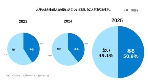 「生成AIの使い方について話したことがある」家庭は約5割とどまり、2023年の調査の約4割という結果と比較して十分に進んでいないということが明らかになった。