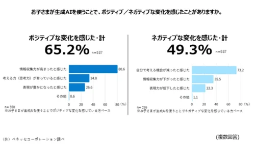 生成AI利用についての効果実感においては、プラスとマイナスが同時に現れる“二面性”が明らかになった。65.2%の保護者がポジティブな変化を感じ、「情報収集力が高まったと感じた」や「考える力(思考力)が育っていると感じた」が挙がる一方、49.3%の保護者が「自分で考える機会が減ったと感じた」などネガティブな変化を感じている。