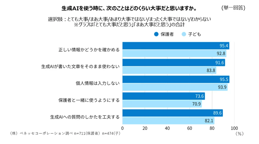 「生成AIを使う時に大事だと思うこと」では、2024年と同様、親子ともに「個人情報は入力しない」が最も高い割合となった。数値に若干の上下はあるものの、重要視されるポイントの傾向は変わらず、その他の項目についても、親子ともに2024年と比較して概ね同水準となっている。
