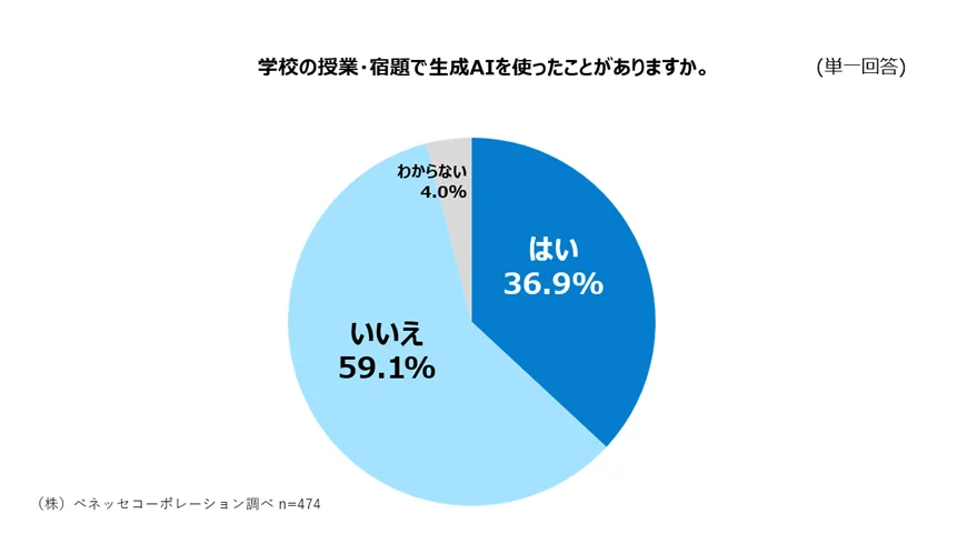 小学生の約4割が学校の授業や宿題で生成AIを活用した経験があると回答。学校現場での生成AIの活用が一定程度広がりつつあることがうかがえる。
