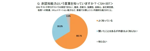 それによると、子どもがいる親世代に「非認知能力という言葉を知っているか?」と尋ねたところ、「よく知っている」と回答した親は6割以上(203人)にのぼり、親の中での認知度の高さが明らかになった。一方で、「聞いたことはあるが内容はよく知らない」も3割(203人)おり、非認知能力について十分に把握ができていない層が、まだ一定数いることが読み取れる結果になった。