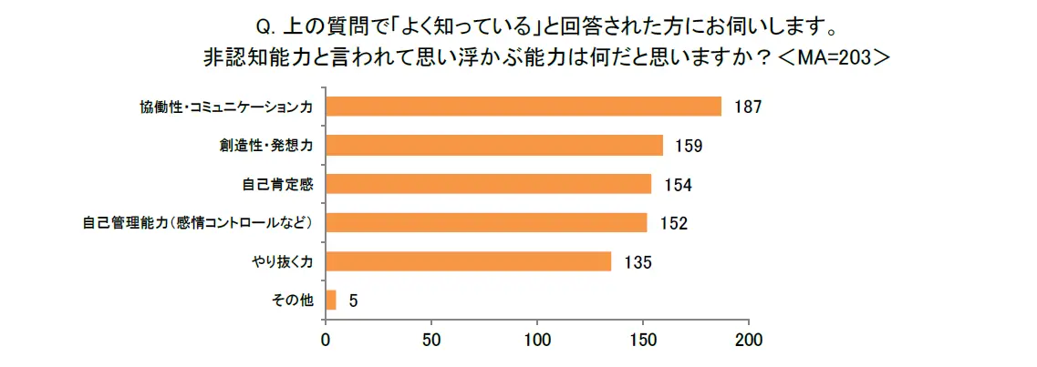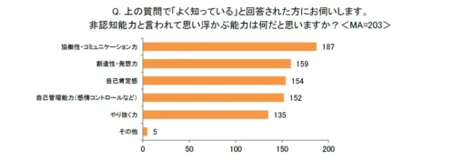 非認知能力を「よく知っている」と回答した親に、「非認知能力と言われて思い浮かぶ能力は何か?」と尋ねたところ、最も多かったのは「協働性・コミュニケーション力」(187人)で、以下、「創造力・発想力」(159人)、「自己肯定感」(154人)が続いたが、どの回答も大差はなく、親の間でも非認知能力には、様々な能力が当てはまると認識していることが伺える。