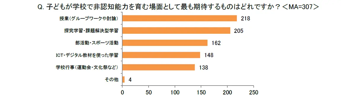 また、「子どもが学校で非認知能力を育む場面として最も期待するもの」を聞いたところ、最も多かったのは「授業(グループや討論)」(218人)で、次いで、「探究学習・課題解決型学習」(205人)だった。学校の総合の時間などでの、人との意思疎通や、関心分野について深堀りする経験を通じて非認知能力を成長させることが求められているようだ。
