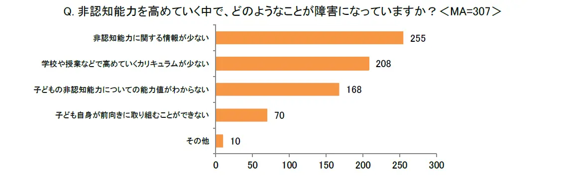 次に、「非認知能力を高めていく中で、どのようなことが障害になっているか?」を聞いたところ、「非認知能力に関する情報が少ない」(255人)や、「学校や授業などで高めていくカリキュラムが少ない」(208人)という声が寄せられた。未だに非認知能力の定義が曖昧な点や、育成・評価方法が確立されていないことへの課題感が読み取れる結果となった。