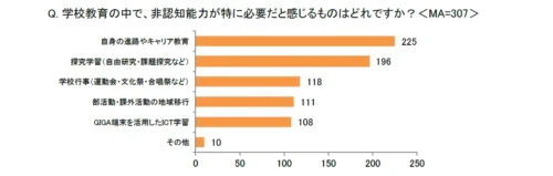 また、「学校教育の中で、非認知能力が特に必要だと感じるものは何か?」を尋ねたところ、「自身の進路やキャリア教育」(225人)が最も多く、非認知能力が一時的なものではなく、大人になってからも社会で生きていくために必要な力だと考えている親が多いことが分かった。