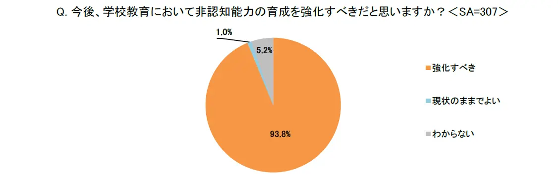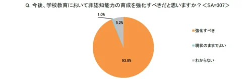 「今後、学校教育において非認知能力の育成を強化すべきだと思うか?」という質問には、9割以上(288人)の親が「強化すべき」と回答。「将来にも活用できる力」と捉え、学校での非認知能力育成を重要視していることが明らかになった。