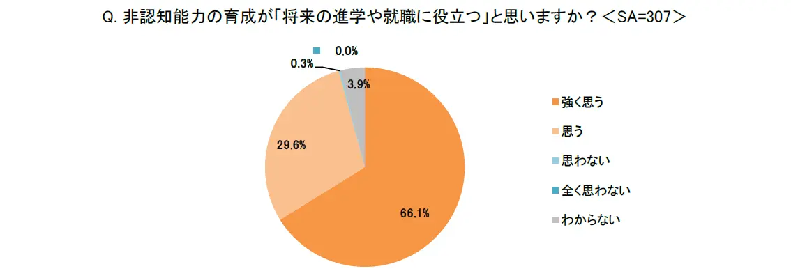 「非認知能力の育成が将来の進学や就職に役立つと思うか?」と尋ねたところ、「強く思う」(203人)と「思う」(91人)を合わせて9割以上の親が、非認知能力に対して肯定的に捉えていることが分かった。