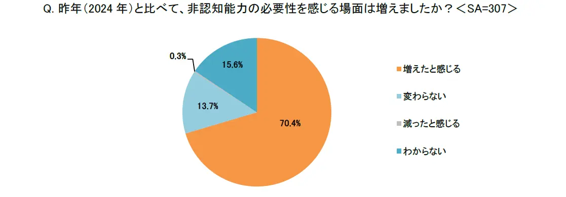 また、「昨年(2024年)と比べ、非認知能力の必要性を感じる場面は増えたか?」との質問には、7割以上(216人)の親が「増えたと感じる」と回答。非認知能力の重要性と有用性を認識する親が増加しており、社会が刻一刻と変化する中で、その重要性はますます増大していることが伺える結果となった。