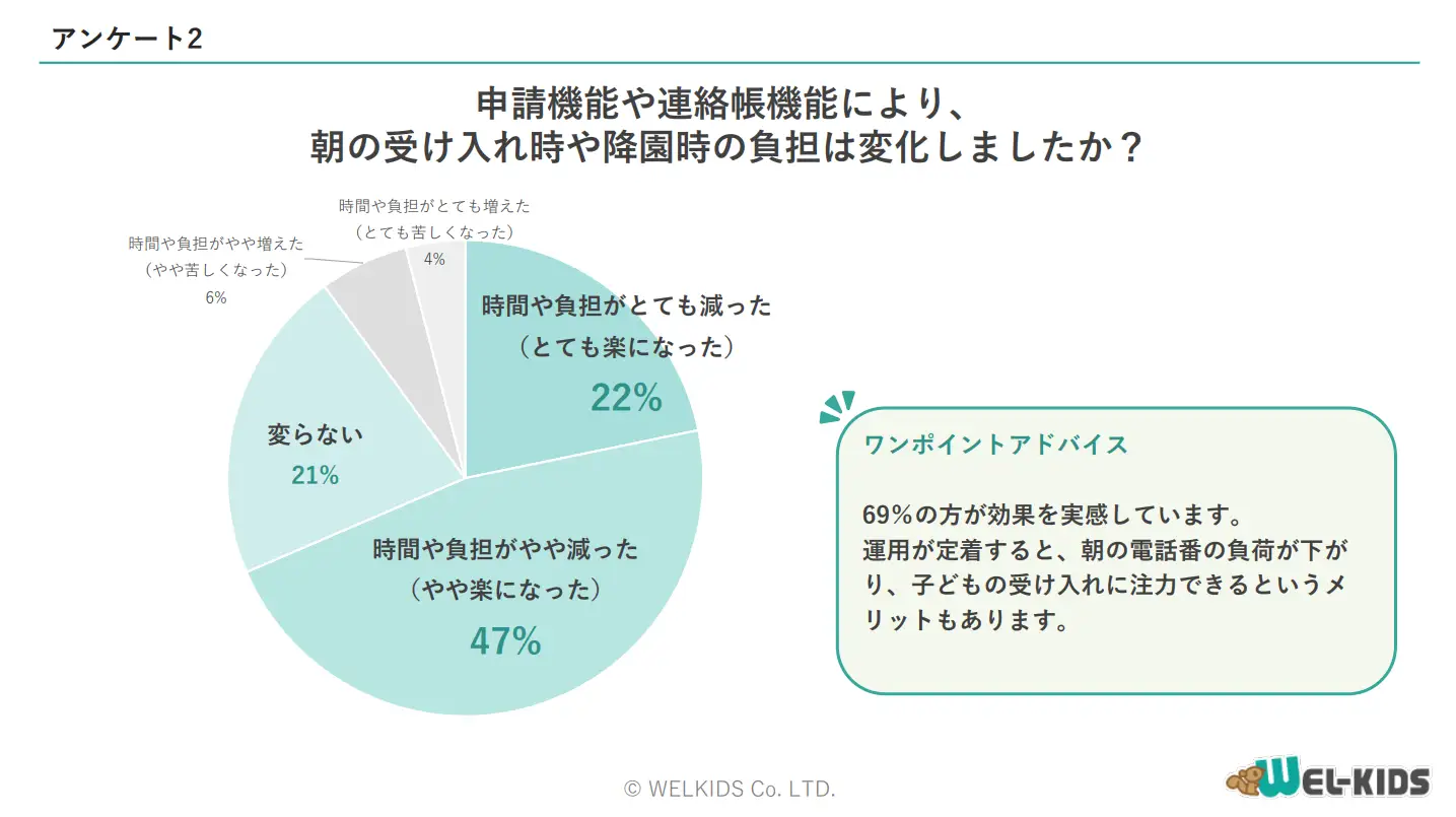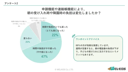申請機能や連絡帳機能の導入後の業務負担の変化について尋ねたところ、「時間や負担がとても減った」、「時間や負担がやや減った」と回答した人は、合計で全体の69%に上った。