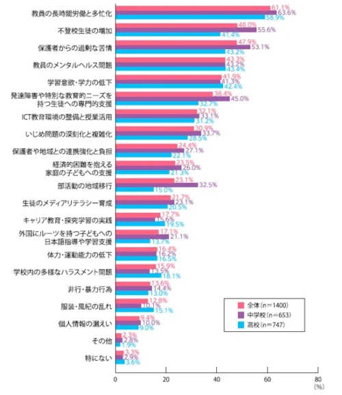 さらに、「教員のメンタルヘルス問題」や、生徒の「学習意欲・学力の低下」、「発達障害や特別な教育的ニーズを持つ生徒への専門的支援」も重要な課題として認識されていた。