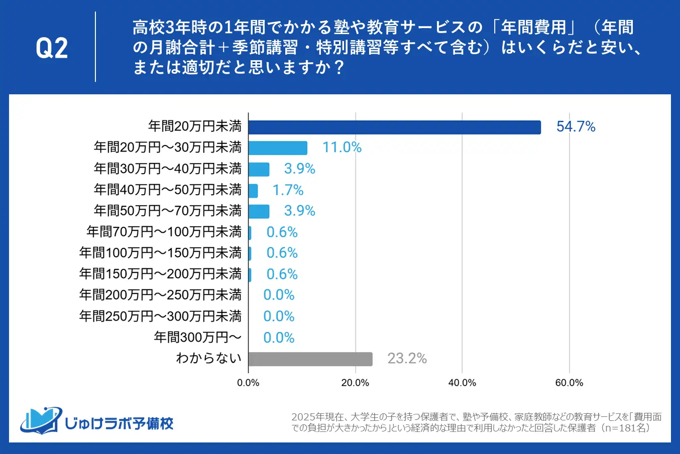 この調査は、2025年現在、大学生の子どもを持ち、塾や予備校、家庭教師などの教育サービスを「費用面での負担が大きかったから」という経済的な理由で利用しなかったと回答した保護者を対象に、8月8日~9月20日にかけてインターネットで実施した。有効回答数は181人。