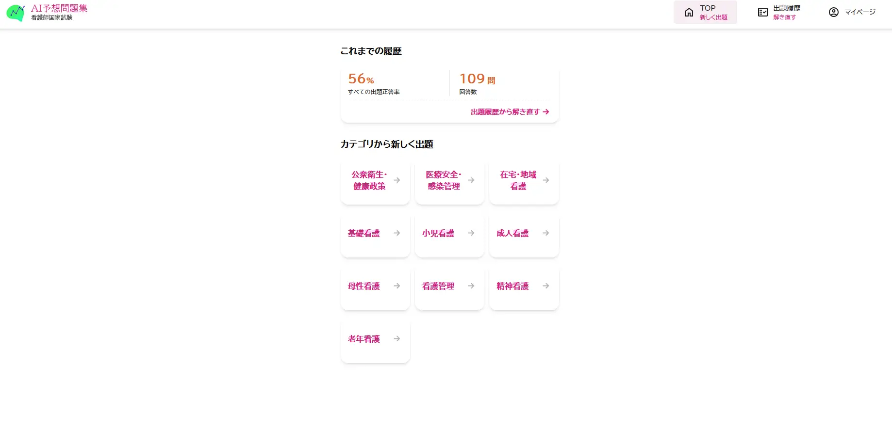 過去数十年分の国家試験データをAIが徹底的に分析し、最新の出題傾向や法改正、医療動向を反映した、より本番に近い質の高い予想問題を自動生成する。一問一答形式で簡単に回答できるほか、出題された問題はすべて保存され、間違えた問題は後から何度でも復習できる。