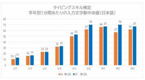 それによると、6月2日~9月30日までに実施し、日本全国の児童生徒4万800人が参加した。「令和7年度 第1回」の検定では、1分間あたりの入力文字数(中央値)は「令和6年度 第1回タイピングスキル検定」と比較するとほぼ全学年で増加した。