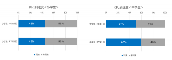 今回検定でのKPI到達度は小学生で45%と「令和6年度 第1回検定」と同じ数値だった。一方、今回の中学生のKPI到達度は「令和6年度 第1回検定」の到達度よりも9ポイントアップし60%となった。
