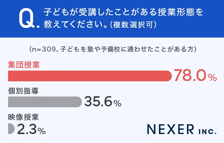 次に、「子どもが受講したことがある授業形態」を尋ねたところ、最も多く利用されていたのは「集団授業」で78.0%と圧倒的だった。多くの保護者が、子どもに集団で学ぶスタイルを1度は経験させていることが分かる。