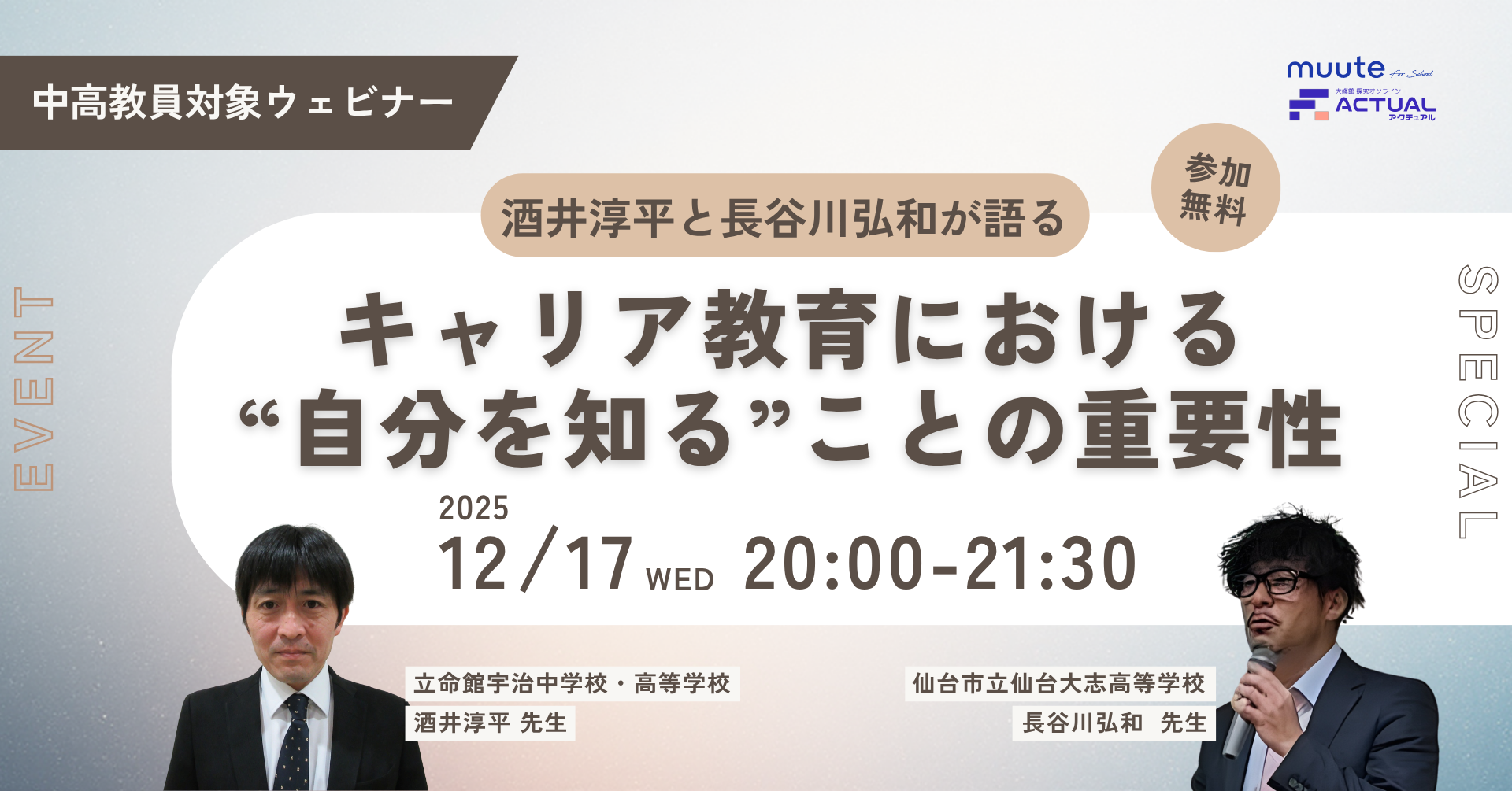 講師を務めるのは、立命館宇治中学校・高等学校の酒井淳平教諭と、仙台市立仙台大志高等学校の長谷川弘和教諭。セミナーでは、自己理解がキャリア形成の基盤となる理由や、生徒が自分の価値観に気づくためのアプローチ、教室で取り入れやすい具体的な実践方法などが紹介される予定だ。