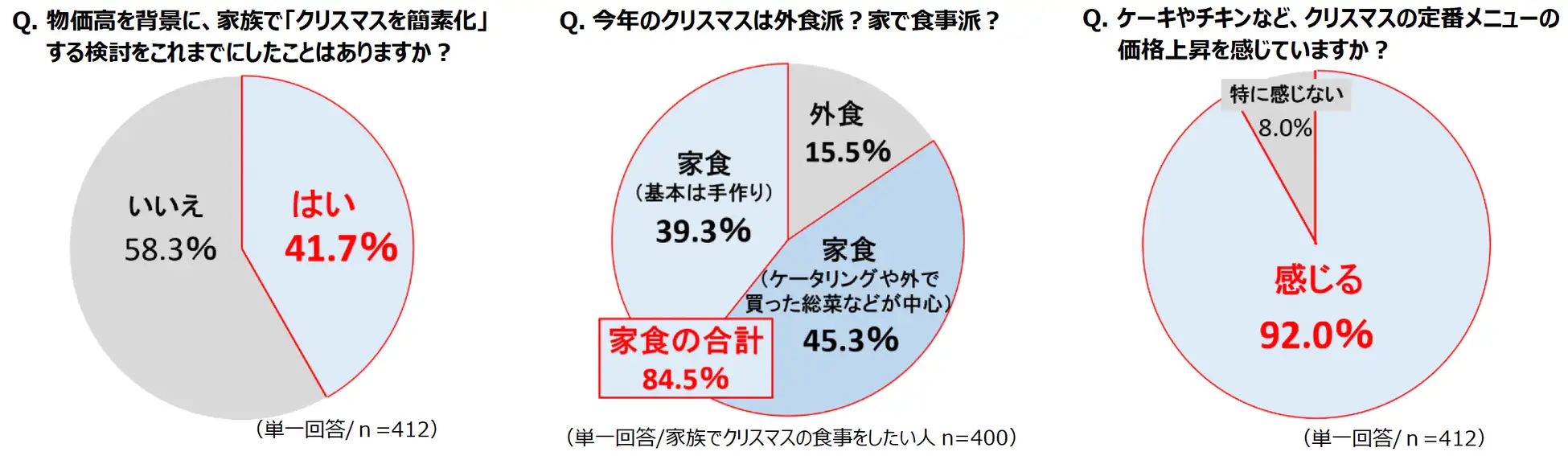 それによると、保護者に、昨今の物価高を背景に、家族で「クリスマスを簡素化する検討をしたことがあるか」を聞いたところ、41.7%が「はい」と回答。さらに、今年のクリスマスに家族と食事をしたいと回答した人に、今年の予定は外食か家食かを尋ねたところ、84.5%が「家食」を選んだ。
