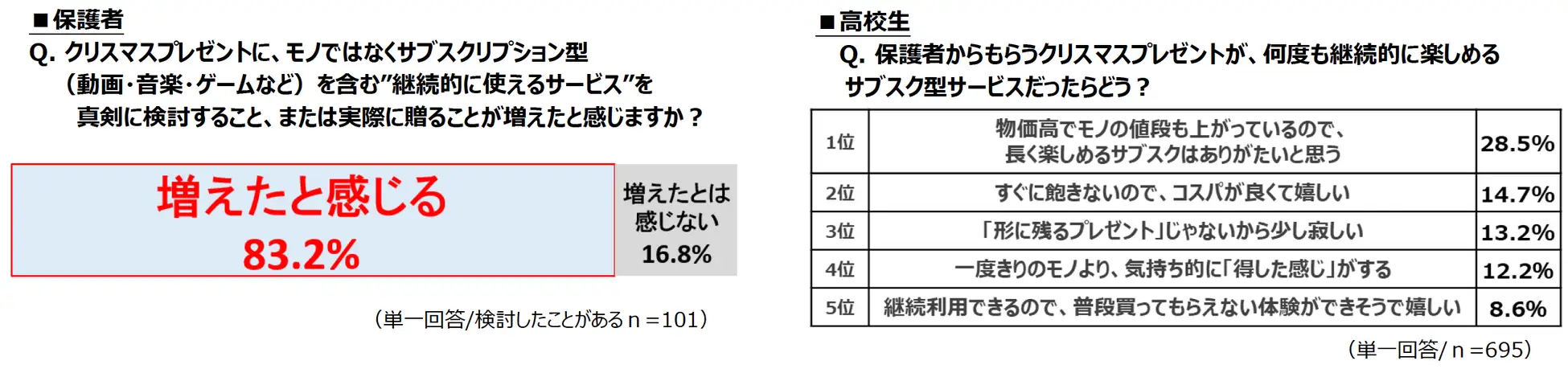 クリスマスプレゼントに、モノではなくサブスクリプション型を含む「継続的に使えるサービス」を検討したことがある保護者に、真剣に検討もしくは実際にプレゼントすることが増えたと感じるかを聞くと、83.2%が「増えたと感じる」と回答。さらに、そのうち85.7%が、昨今の「物価高が影響している」と答えた。