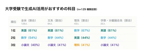 今、受験生だったら生成AIを使いたい科目のTOP3は、どちらも1位「英語」、2位「数学」、3位「小論文」となった。英語は文系・理系どちらも必要な科目であることから1位になっている。現在、文系学部に通う学生が約5割いたが、それでも数学が2位にランクインしており、数学の学習中のサポートに対するニーズの高さがうかがえた。