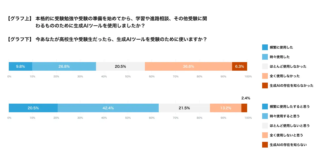 それによると、今、高校生や受験生だったら生成AIツールを受験のために「頻繁に」または「時々」使用したいと回答した人は62%。実際の大学入試において生成AIツールを「頻繁に」または「時々」使用したと回答した人は37%だった。生成AIの利用率自体が年々上昇していること、また大学生活で活用した経験によって、活用意向が高まっていると考えられる。