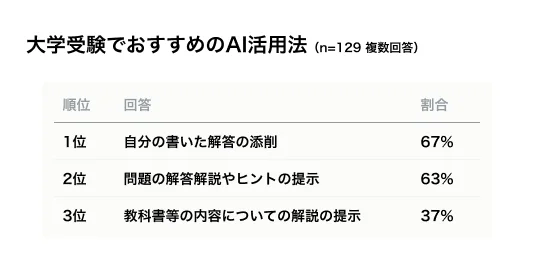 今ならこう使いたいという使用用途のTOP3は、1位「自分の書いた解答の添削」(68%)、2位「問題の解答解説やヒントの提示」(63%)、3位「教科書等の内容についての解説の提示」(37%)。対話しながらヒントを提示してもらったり、面接対策を行ったりするという、生成AIならではの使い方がランクインした。