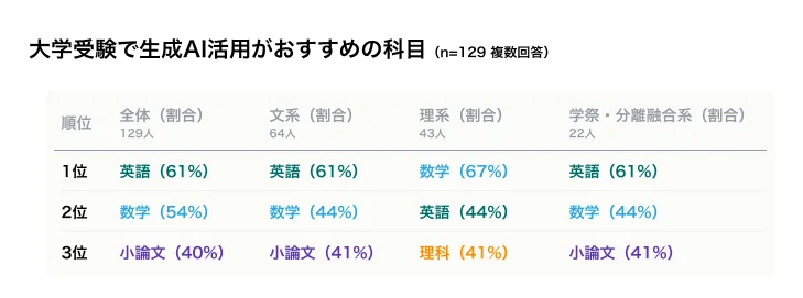 今、受験生だったら生成AIを使いたい科目のTOP3は、どちらも1位「英語」、2位「数学」、3位「小論文」となった。英語は文系・理系どちらも必要な科目であることから1位になっている。現在、文系学部に通う学生が約5割いたが、それでも数学が2位にランクインしており、数学の学習中のサポートに対するニーズの高さがうかがえた。