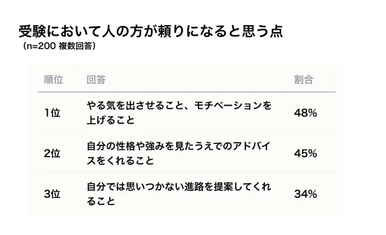 受験において人のほうが頼りになると思う点の1位には「やる気を出させること、モチベーションを上げること」(48%)、2位は「自分の性格や強みを見たうえでのアドバイスをくれること」(45%)、3位は「自分では思いつかない進路を提案してくれること」(34%)となった。