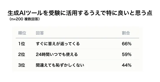 生成AIツールを受験に活用するうえで特に良いと思う点TOP3は、1位「すぐに答えが返ってくる」(66%)、2位「24時間いつでも使える」(59%)、3位「間違えても恥ずかしくない」(44%)だった。学校や塾で先生に質問できないタイミングでも質問ができること、また、同じ質問や細かい質問をしても恥ずかしくないという点で評価されていることがうかがえる。