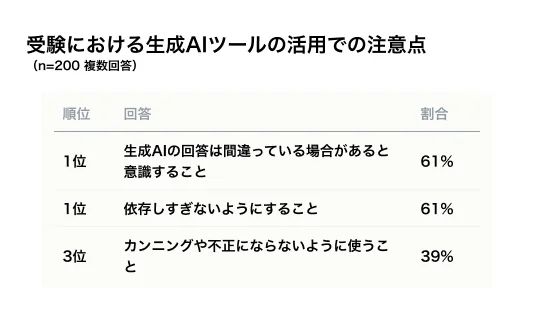 受験における生成AIツールの活用での注意点は、「生成AIの回答は間違っている場合があると意識すること」(61%)など、「依存しすぎないようにすること」(61%)などがあがっており、十分なリテラシーを持っていることがうかがえた。