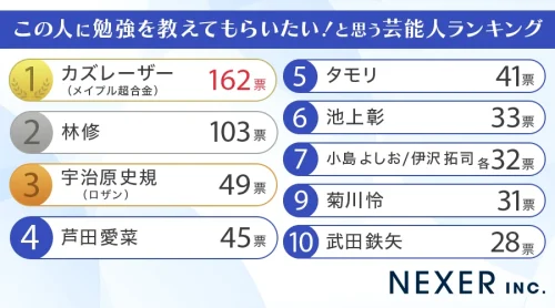 3. 勉強を教えてもらいたい芸能人、3位宇治原史規、2位林修、1位は?=NEXER調べ=