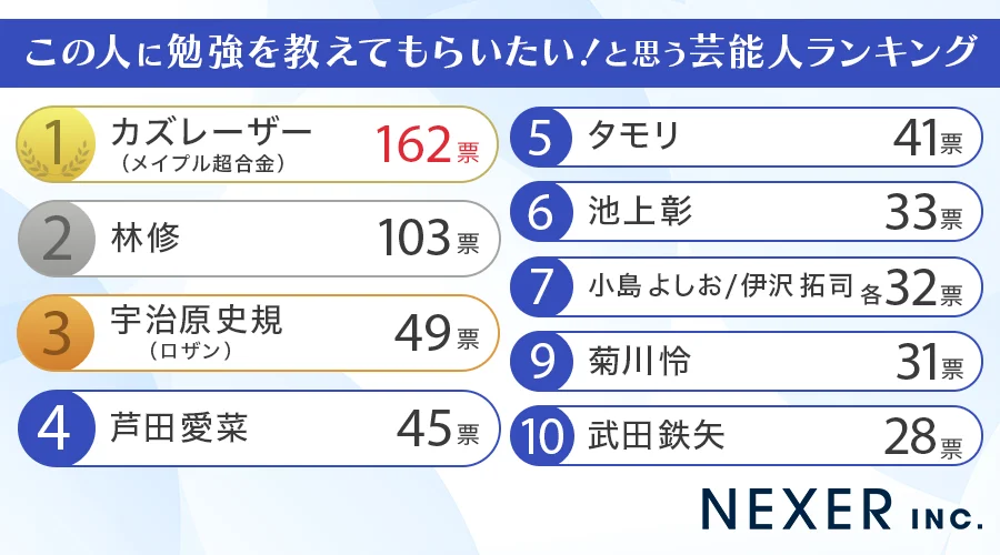 NEXERは1日、家庭教師のラストと共同で、全国の男女1000人を対象に実施した、「勉強を教えてもらいたい芸能人」のアンケート調査の結果をまとめ発表した。(敬称略)