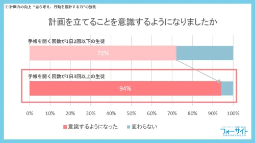 それによると、1日3回以上手帳を開く生徒の94%が計画を立てる力が向上したと回答、81%が家庭学習の習慣が定着したと回答、86%が成長の実感が感じられるようになったと回答したという。