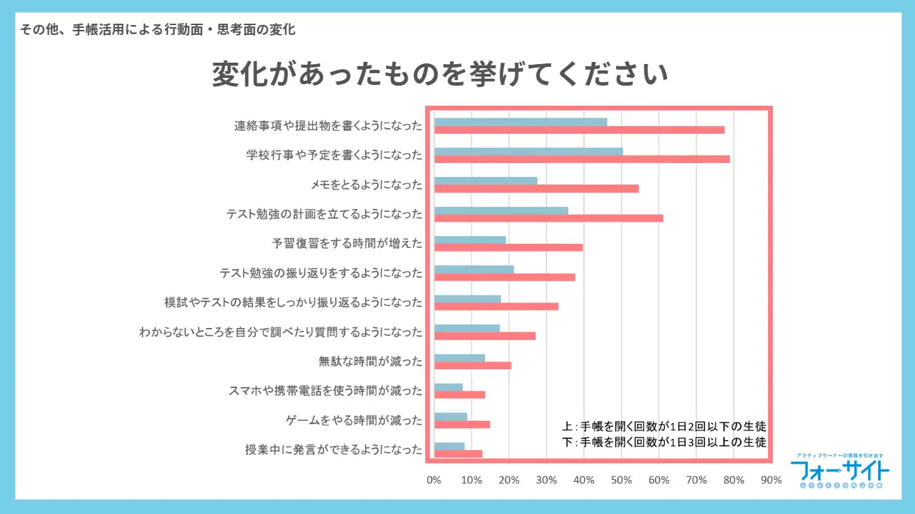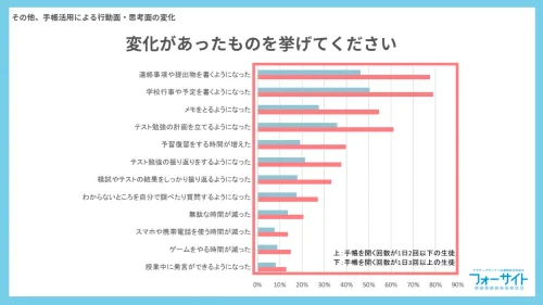 また、フォーサイトの活用により変化があった項目を複数回答で訊ねたところ、すべての項目で1日3回以上手帳を開く生徒が2回以下の生徒の割合を上回った。特に「学校行事や予定」「連絡事項や提出物」「テスト勉強の計画」など予定や計画を記載する項目で、変化を実感している生徒が多く見られたとしている。