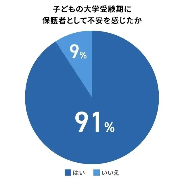 それによると、「子どもの大学受験期に保護者として不安を感じたか」と聞いたところ、保護者の91%が「はい」と回答した。一方、「大学受験に向けて子どもは不安を感じていたか?」と尋ねたところ、「はい」と回答した保護者は61%で、その差は実に30%。