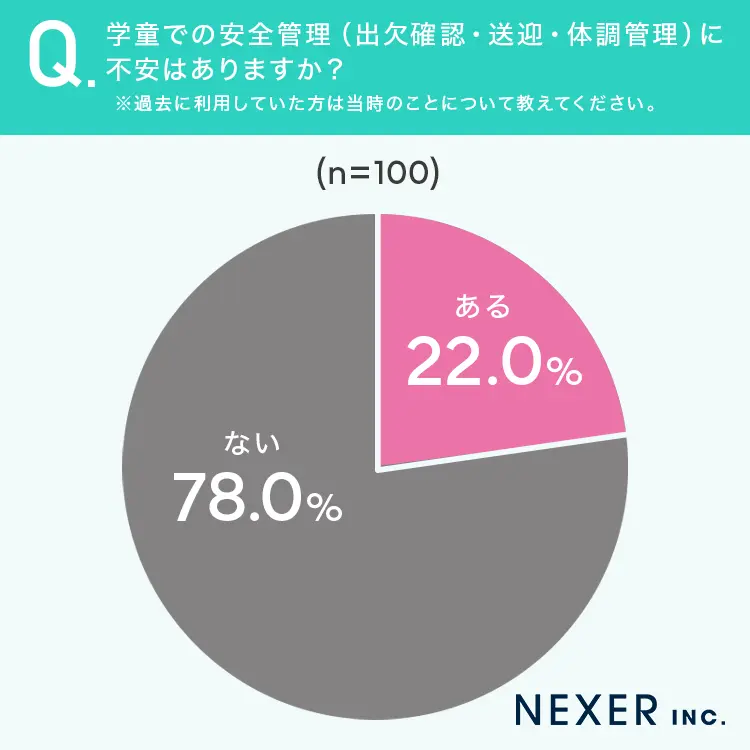 「学童での安全管理(出欠確認・送迎・体調管理)に不安はありますか?」の問いには、22%と2割以上の人が、学童での安全管理に不安が「ある」と回答している。