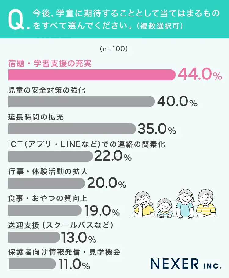 「今後、学童に期待することとして当てはまるものをすべて選んでください」の問いには、最多が「宿題・学習支援の充実」、次いで「安全対策の強化」の結果になった。